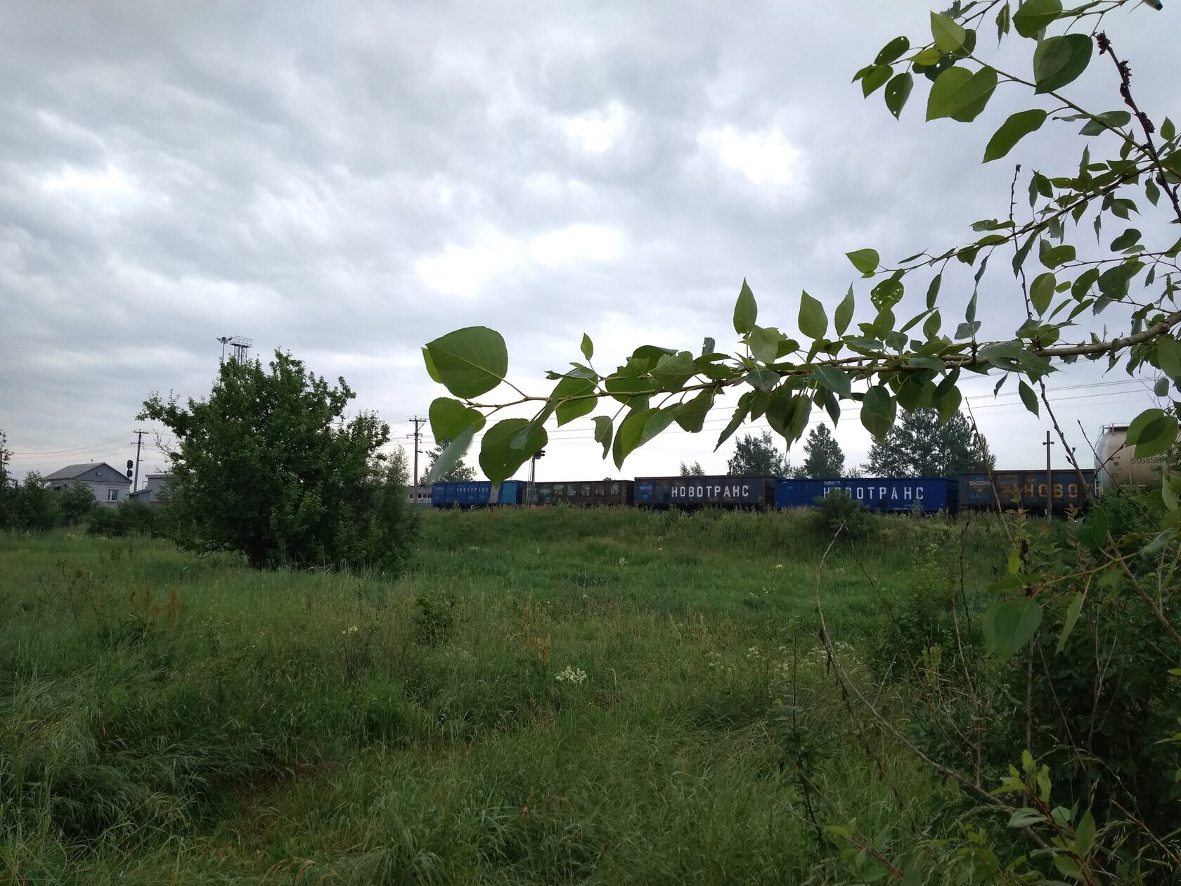 Ветка до Великих Лук оказалось довольно красивой — поля сменялись на леса и болота, растительность часто подходила очень близко к путям, а ветки деревьев и кустов бились об наш вагон. На нескольких станциях мы вставали под пропуск встречных поездов. По погоде было тоже всё довольно неплохо, если в Ржеве шёл небольшой дождь, то тут периодически выходило солнце, и ехать было довольно комфортно. Но через примерно полтора часа после того, как мы отправились из Ржева, небо полностью закрыло тучами, и стало понятно, что нас ждёт гроза. Проблема заключалась в том, что у нас не было никакой возможности как-либо спрятаться от непогоды, полувагон был практически полностью наполнен углём. Я заранее решил надеть свой плащ, ехать мокрым как-то не хотелось, честно говоря. В какой-то момент мы въехали в грозовой фронт, стало темно, полил ливень, повсюду сверкали молнии, а поезд мчал нас в ритме 70 в сторону Великих Лук. Проскочив грозу, мы встали под пропуск встречки на одной из станций, вышло солнце, и было трудно поверить в то, что ещё буквально 25 минут назад нас заливало дождём.