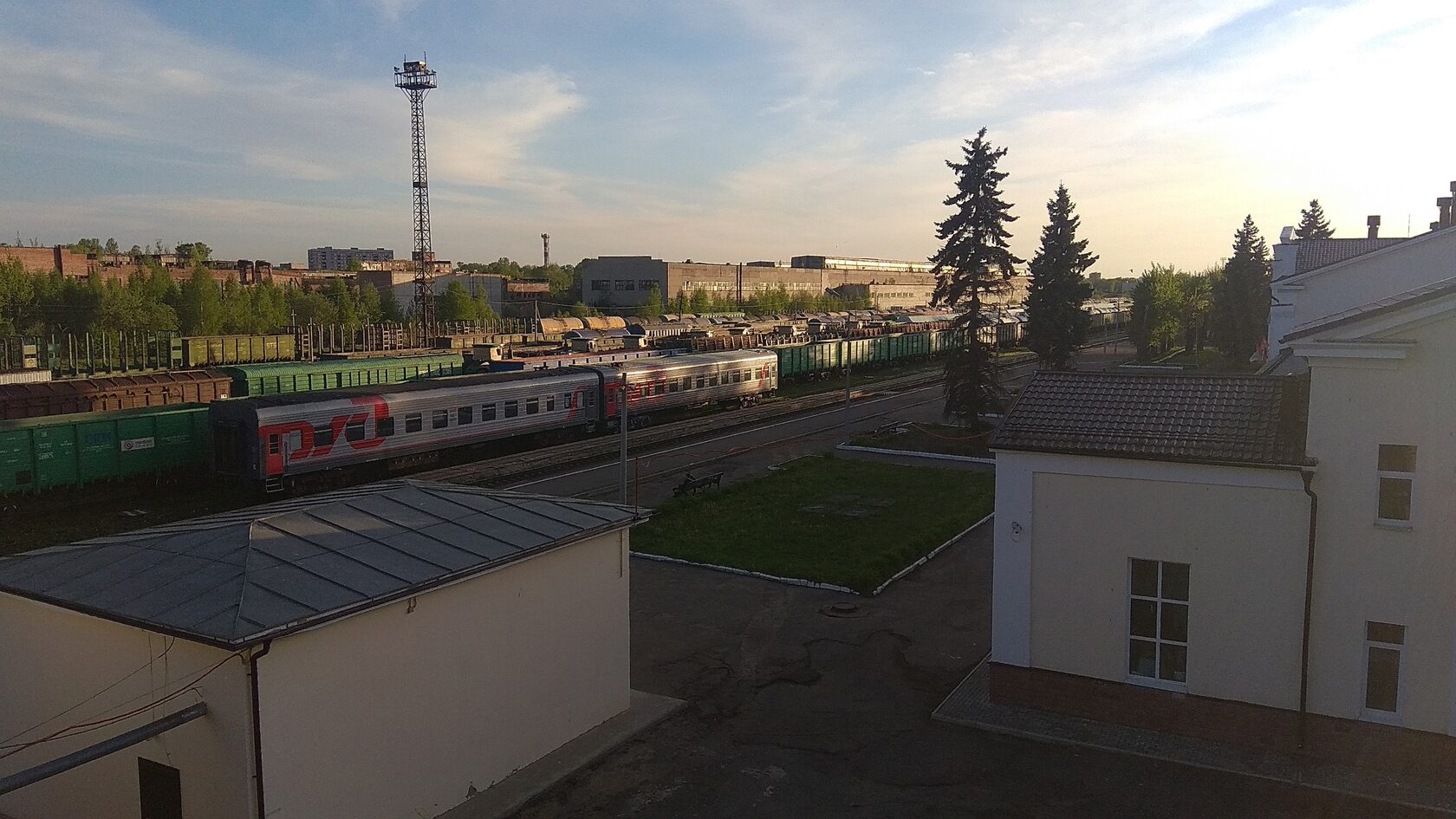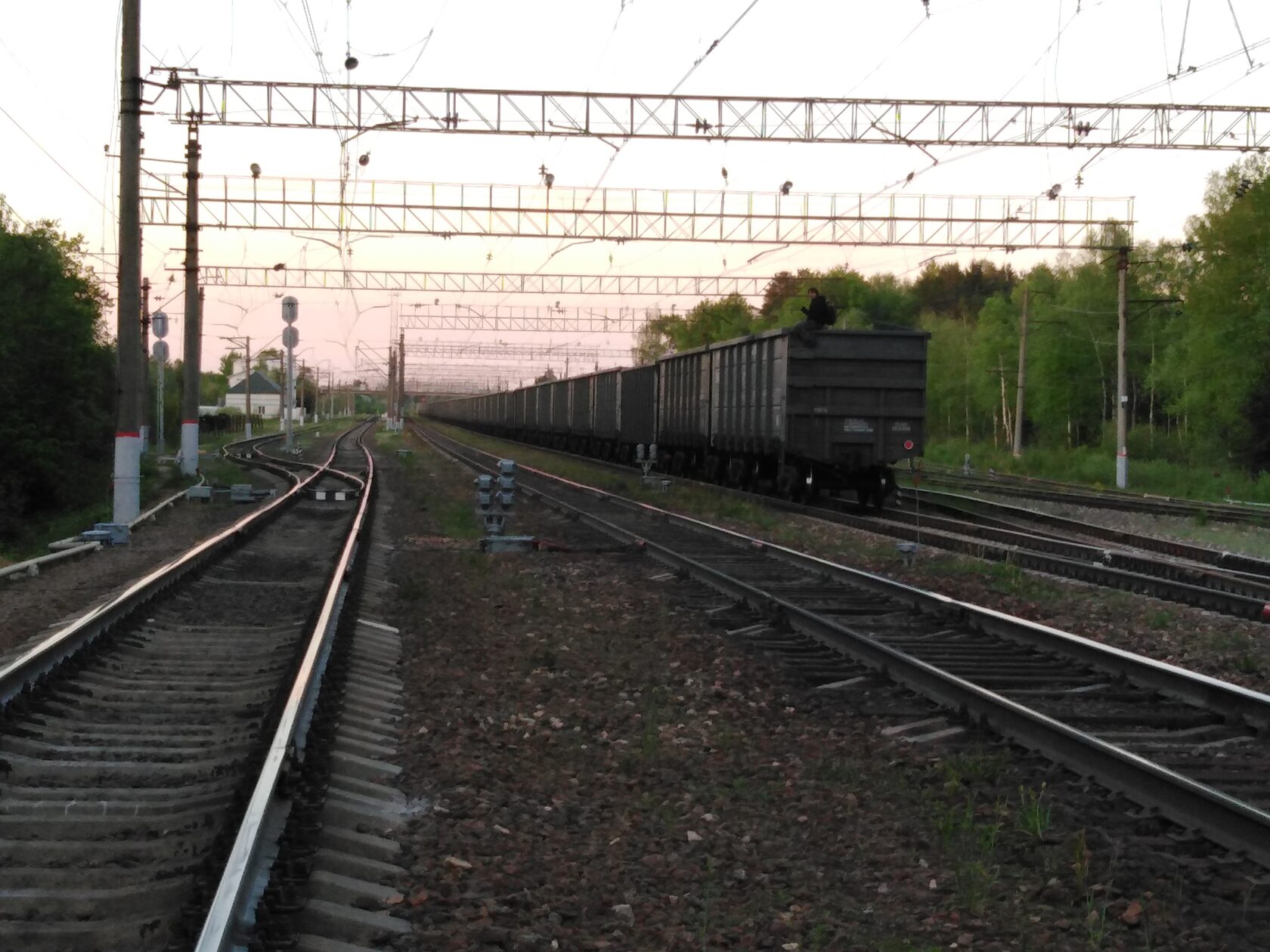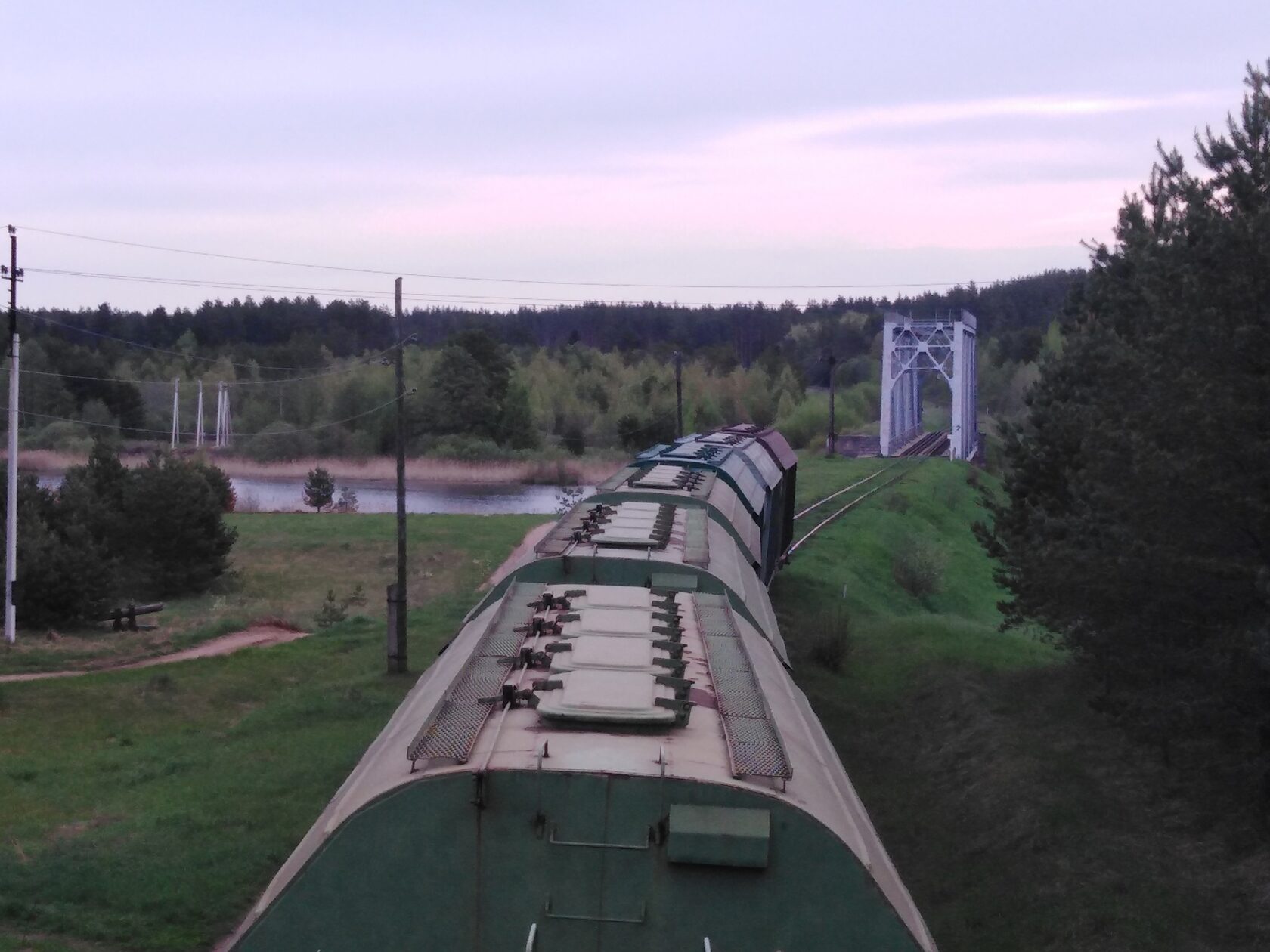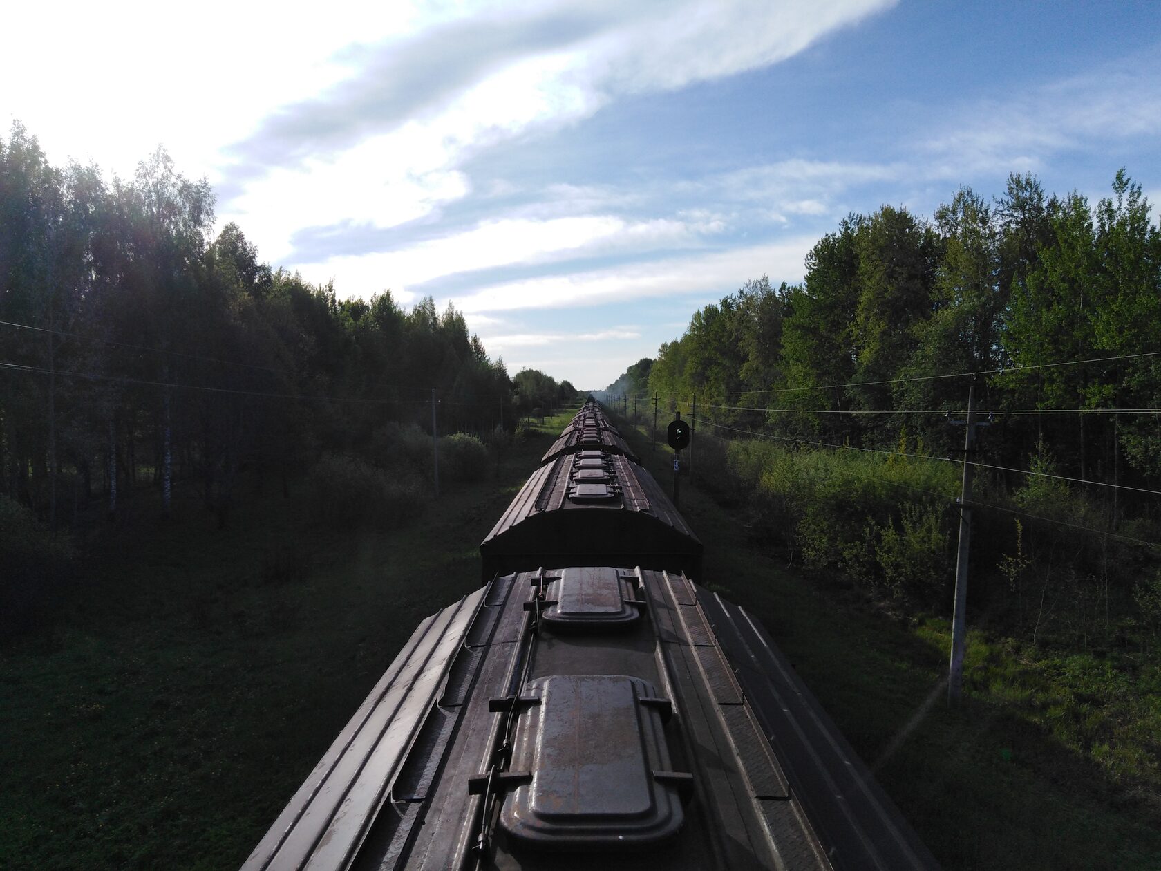Следующая наша станция была Бологое-Полоцкое, где произошло скрещение на малом ходу со встречным грузовым. На всякий случай спрятались от встречного поезда и от здания ДСП за бортик вагона сбоку, держась за выступающие части вагона. Это было достаточно опасно, можно было за что-то зацепиться снаружи так как мы были уже за габаритом поезда. После проезда станции вылезли на крышу и начали наслаждаться видами.