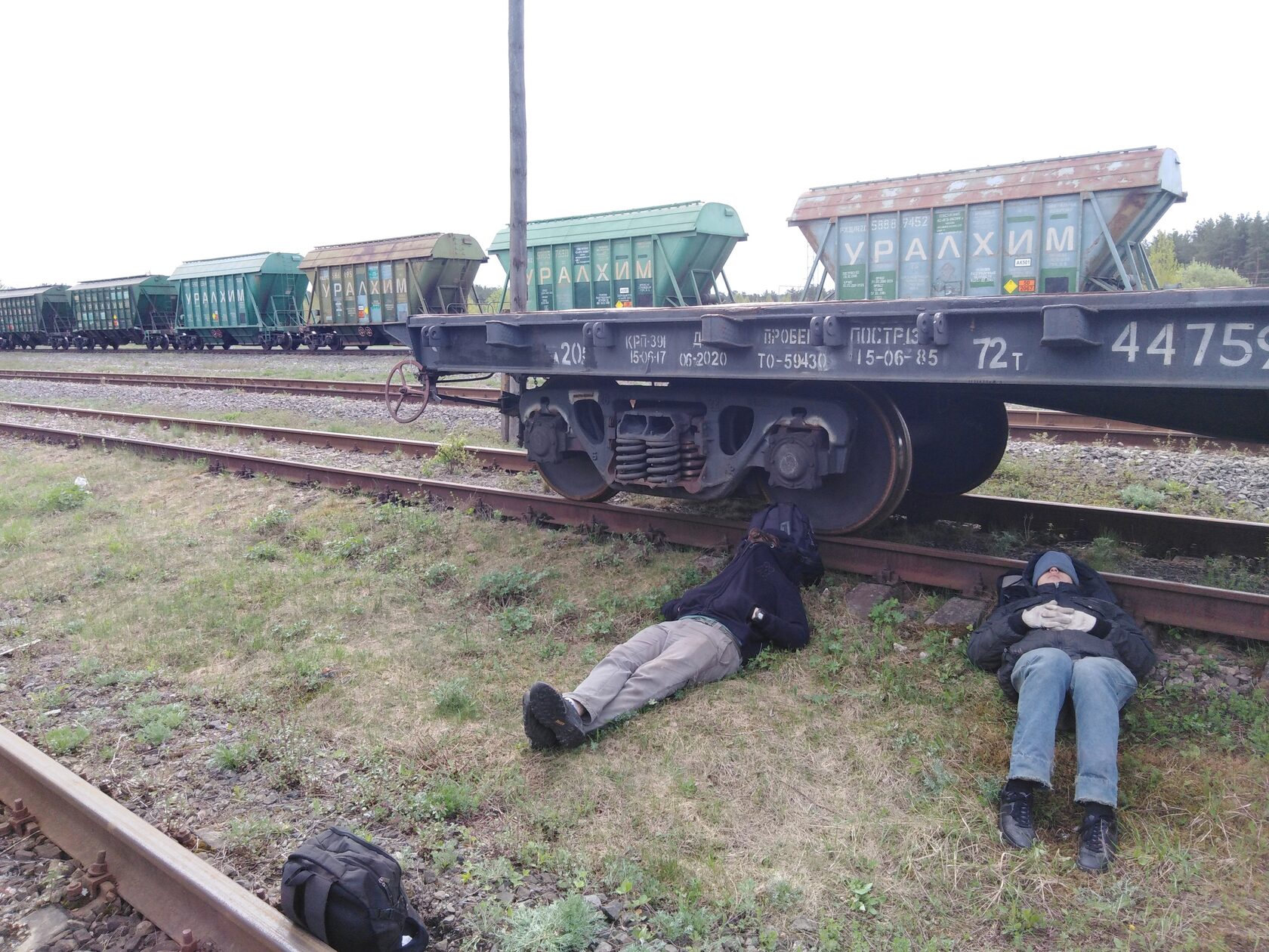 Я прибегаю к Арсению на дорогу в кустах между парками, быстро беру свой рюкзак, ставлю батарейки в приёмник, включаю его и слышу, как нашему поезду объявляют отправление. Мы аккуратно, дабы не привлекать внимания, подходим к парковым путям со стороны каких-то задворков, в этот момент состав трогается. Осматриваемся — где-то вдалеке возле головы стоит рыжуха, осматривает отправление поезда, сейчас она нас точно не увидит. Аккуратно запрыгиваем на один из хопперов примерно при скорости 10 км/ч и сразу же начинаем прятаться под раму вагона. Если спуститься в самый низ на тележку, снять рюкзак и нагнуться, то нас очень хорошо закрывают конструкции вагона, увидеть можно разве что, специально смотря конкретно на этот вагон, конкретно в это место.