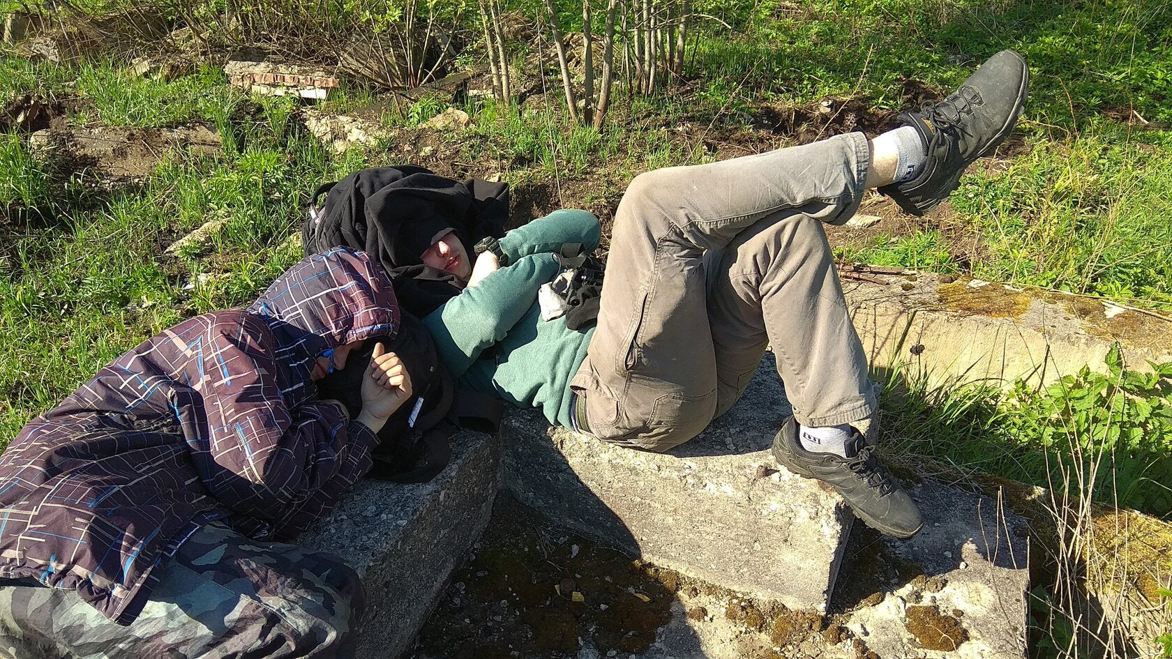 По прибытию сразу пошли искать место для ожидания отправления. Нашли какие-то бетонные плиты и стали на них откисать.