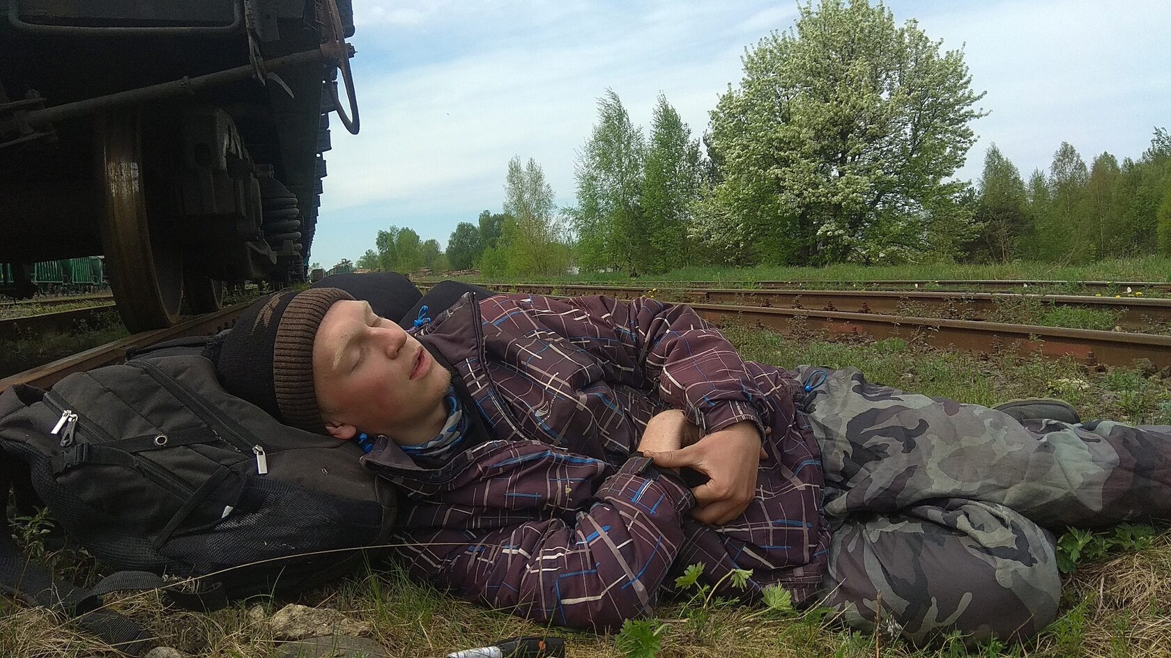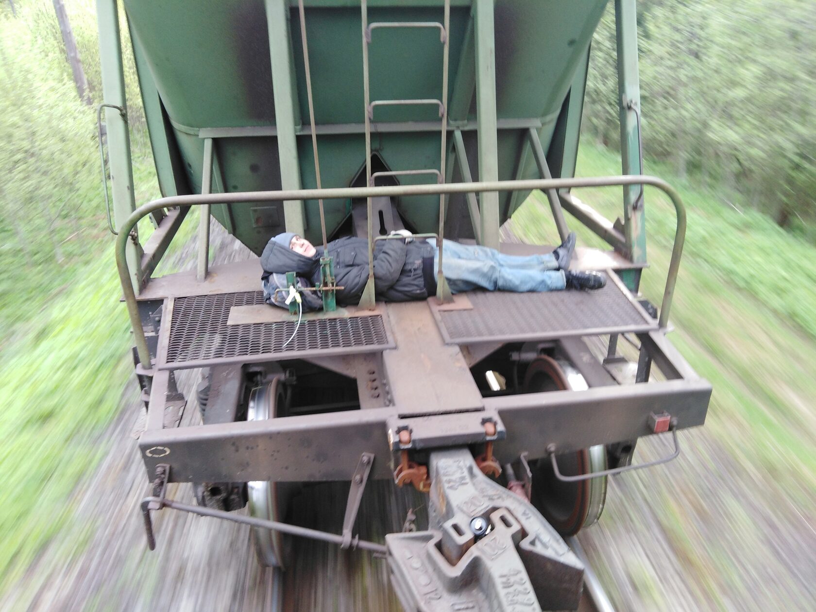 Нас дико сплющило, время будто ускорилось и пролетело за пару секунд. Я проснулся от шипения по приёмнику, кажется, объявили отправление на Гарнею — уехал один поезд на границу с Латвией. На часах примерно 01:30, выпала роса и стало весьма холодно для середины мая… Арсений спал рядом и немного дрожал от холода. Я пошёл снова к забору проверить подцепку и увидел горящие буферные фонари тепловоза, он стоял подцепленный к составу и, видимо, пробовал тормоза. Я вернулся к Сене и начал его будить, чтобы он был наготове. Он проснулся и сказал, как же круто проводить ночь в Себеже, на что я ему ответил: «Ага, аж трясёт…» Через несколько минут по приёмнику сообщили о том, что на второй путь принесли путевую записку и справку о тормозах, после чего объявили об отправлении чётного грузового поезда. Далее по громкой объявили отправление грузового на Заваруйку (следующая станция к востоку от Себежа). Мы хотели уехать любой ценой, поэтому, как только проехал тепловоз, подбежали к поезду и поймали третий с головы вагон, это не было опасным — всё равно темно. К слову, состав уже шёл на скорости 20−22 км/ч и продолжал разгон. Контейнер в полувагоне тоже был нам очень удобен, чтобы не спалиться рамке.
