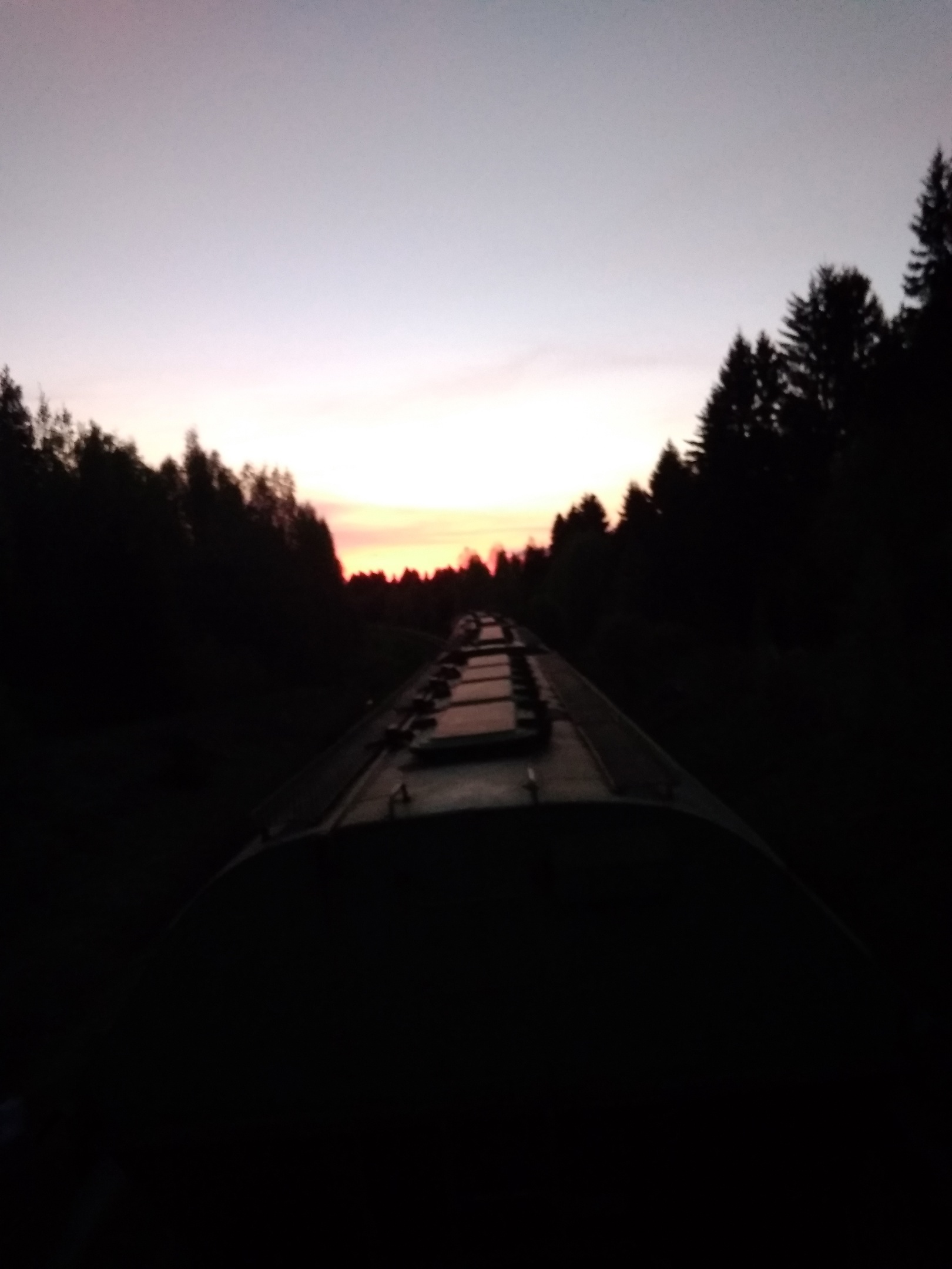 После этого снова завалились дремать в одном из полувагонов. После этого я уже проснулся при проследовании Новосокольников и стал смотреть на рассвет за холмистой местностью Псковской области.
